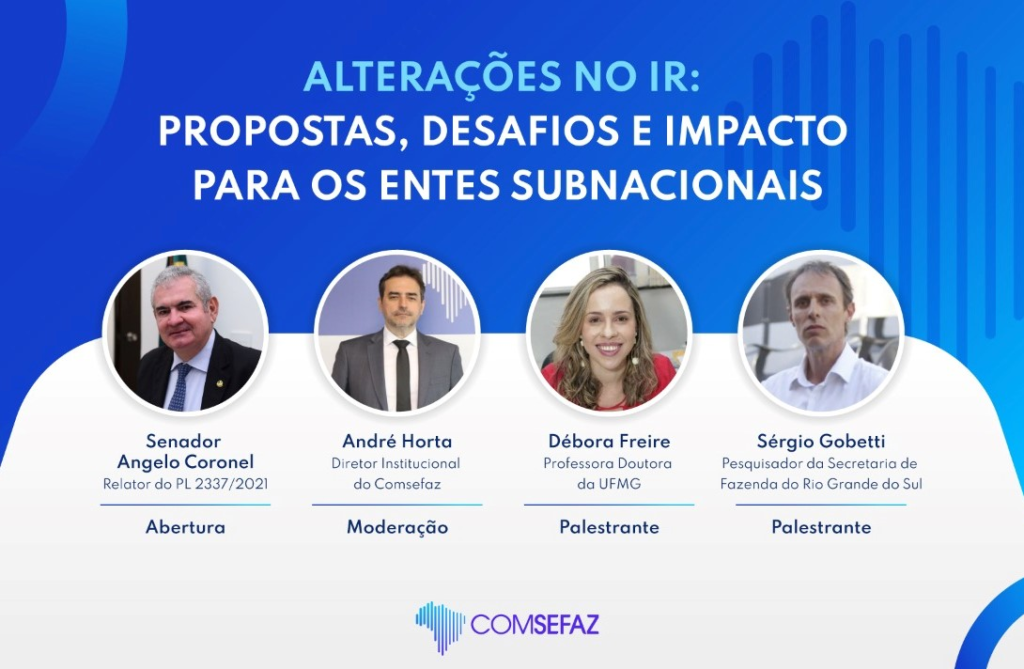O Comsefaz (Comitê Nacional dos Secretários de Fazenda do Estados e do Distrito Federal) promove nesta quinta-feira (16), o Seminário Alterações no IR: Propostas, Desafios e Impacto para os Entes Subnacionais. Terá início às 14h30, por videoconferência, com transmissão ao vivo pelo Youtube.