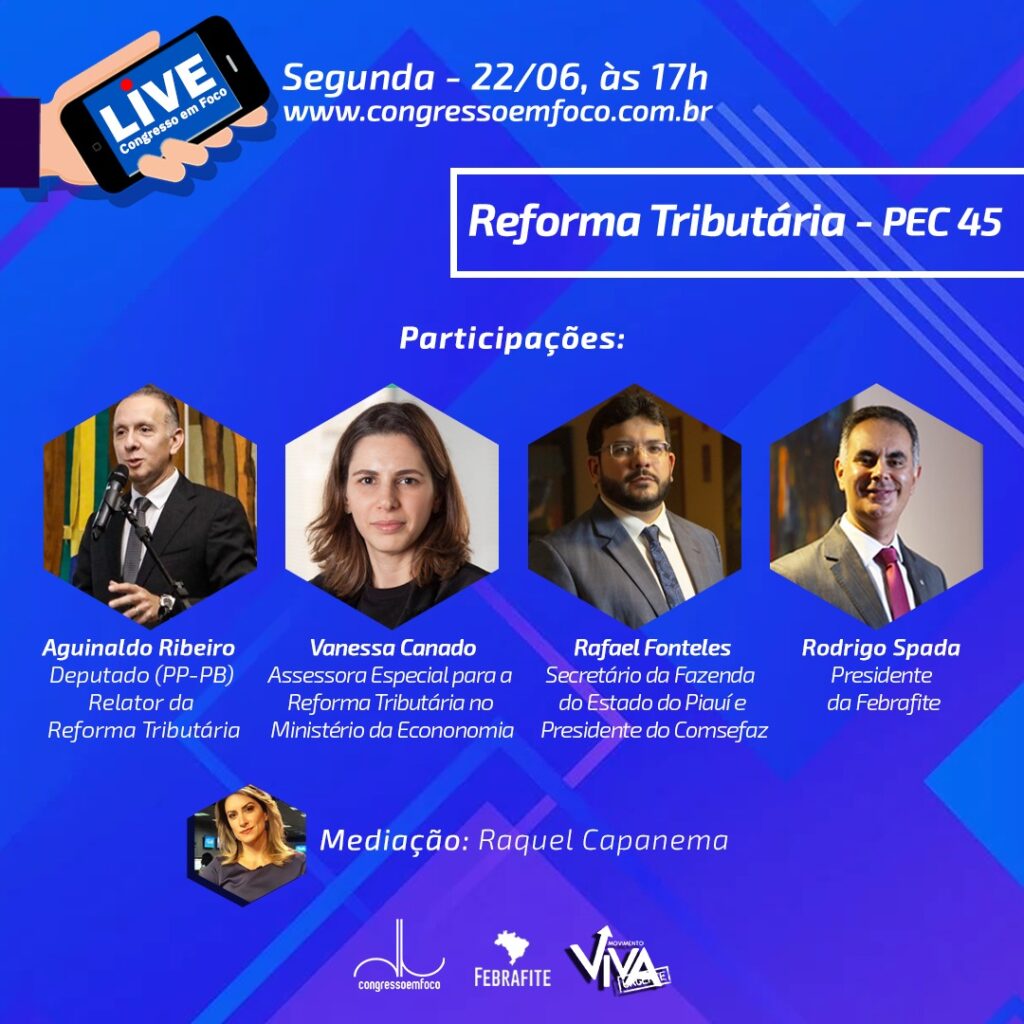 A live do Congresso em Foco terá como debatedores o presidente do Comsefaz (Comitê Nacional de Secretários de Fazenda, Finanças, Receita ou Tributação dos Estados e do Distrito Federal), Rafael Fonteles; o presidente da Febrafite, Rodrigo Spada; o relator da PEC 45/2019, deputado Aguinaldo Ribeiro; e a assessora especial para a Reforma Tributária do Ministério da Economia, Vanessa Canado.