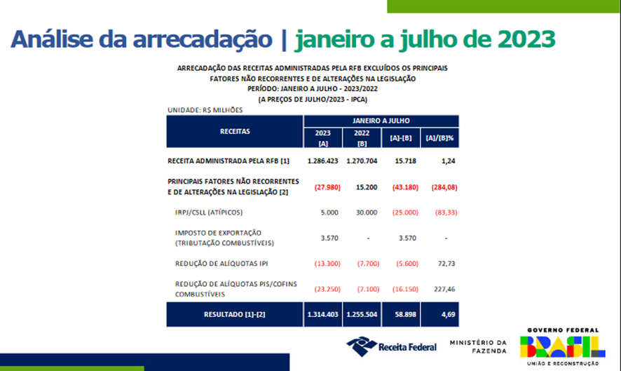 A contração da rubrica da arrecadação atípica de IRPJ e da CLSS no acumulado do ano, entre janeiro e julho, que teve um impacto de -83,3%, passando de 30 bilhões/2022 para R$ 5 bilhões/2023, deve ser entendida como um retorno à trajetória normal das movimentações não recorrentes, segundo os técnicos.