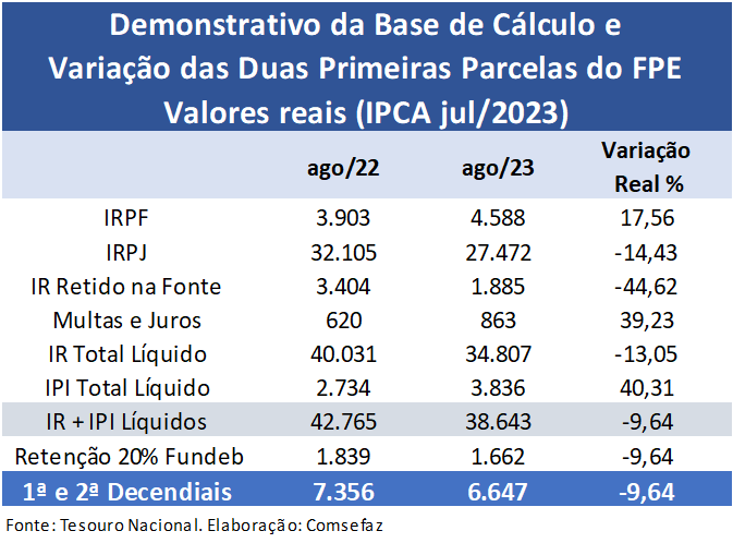 Até o momento, a transferência do FPE em agosto, consideradas essas primeira e segunda parcelas, apresentou queda real de 9,64%, corrigidos pelo IPCA. As duas primeiras parcelas do FPE caíram de R$ 7,56 bilhões em agosto/2022 para R$ 6,64 bilhões em agosto de 2023, conforme mostra a tabela abaixo.